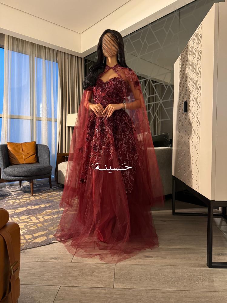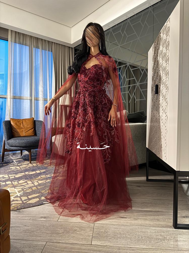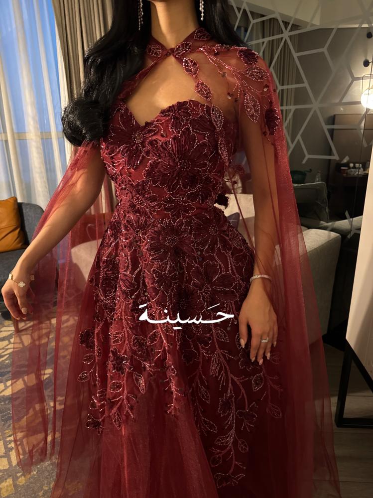 فستان عنّابي فخم ملكيفستان عنّابي ملكي، تصميمه يدمج بين النعومة والهيبة:من الخلف: ورود كثيفة مطرزة كأنها مزروعة على كتف ملكة، وذيل تول شفاف ينزل بنعومة.