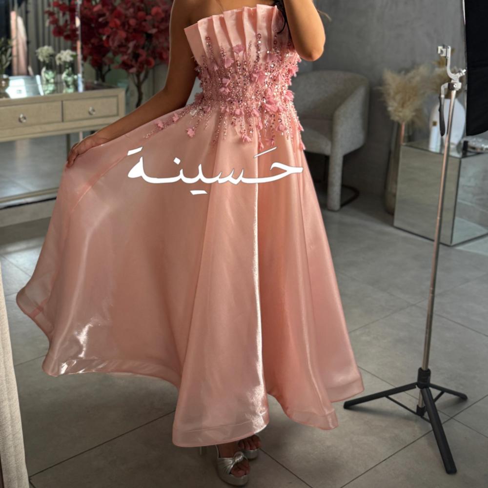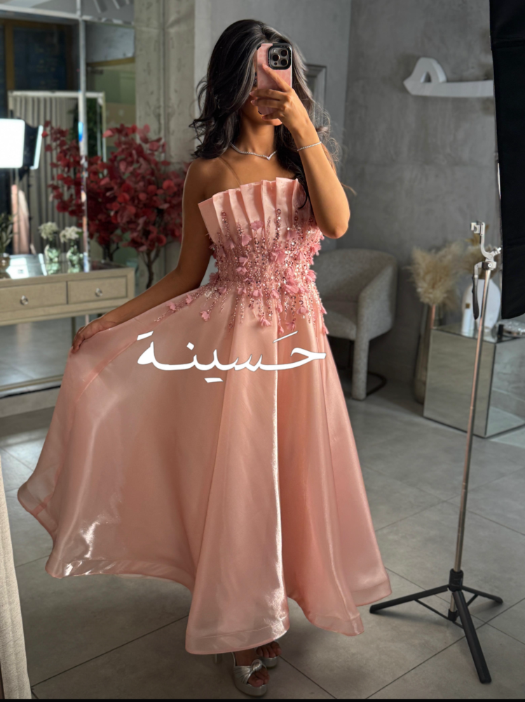 فستان وردي مكسر بتطريز ناعم ثلاثي الأبعادفستان وردي ناعم بطيات هندسية وتطريزات وردية ناعمة، بقصة ميدي حالمة تجمع بين البراءة والترف.