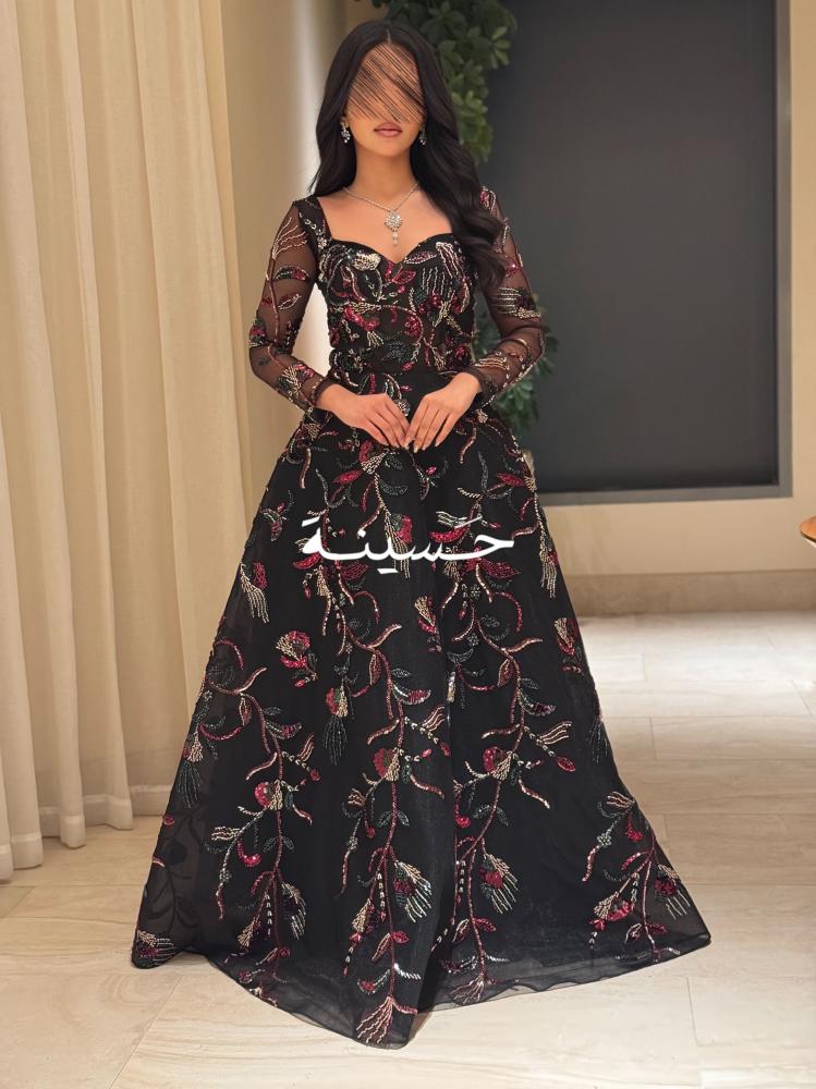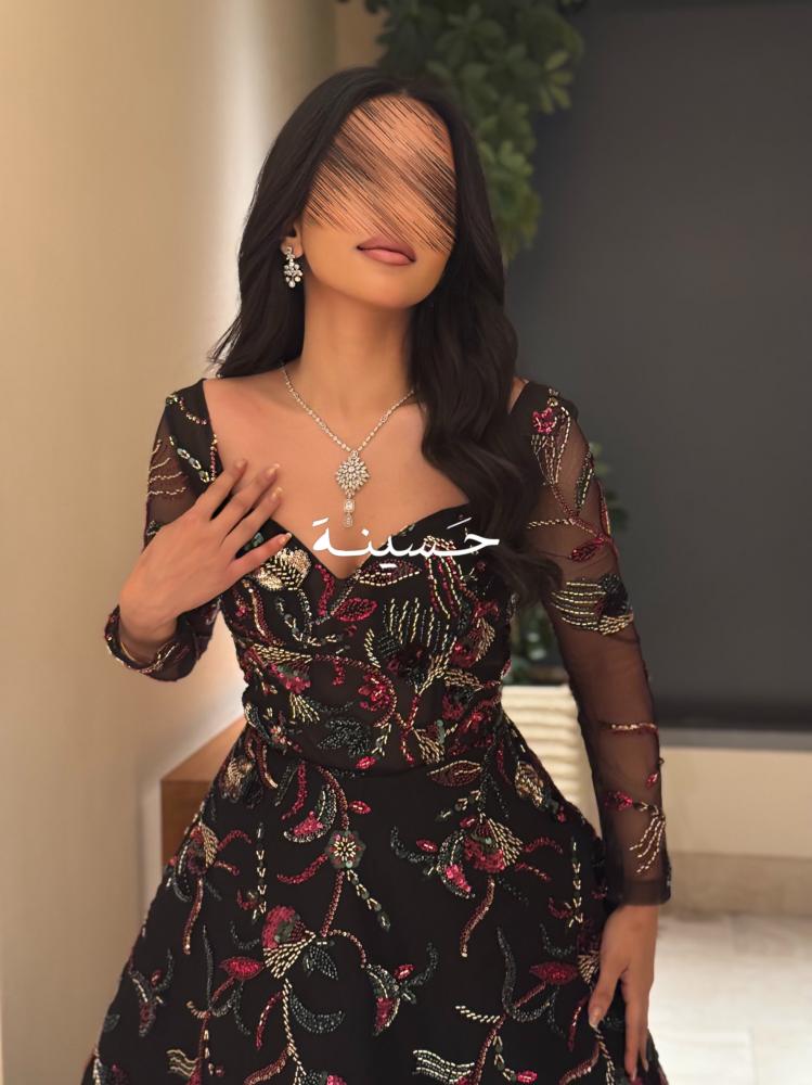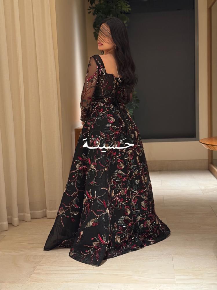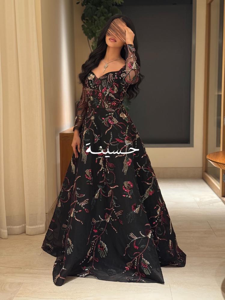 فستان أسود من حسينة بخامة الشيفون الفخم، والتطريزات المتناثرة بألوان مبهرة تعطيه لمسة ملكية فخمة بكل معنى الكلمة