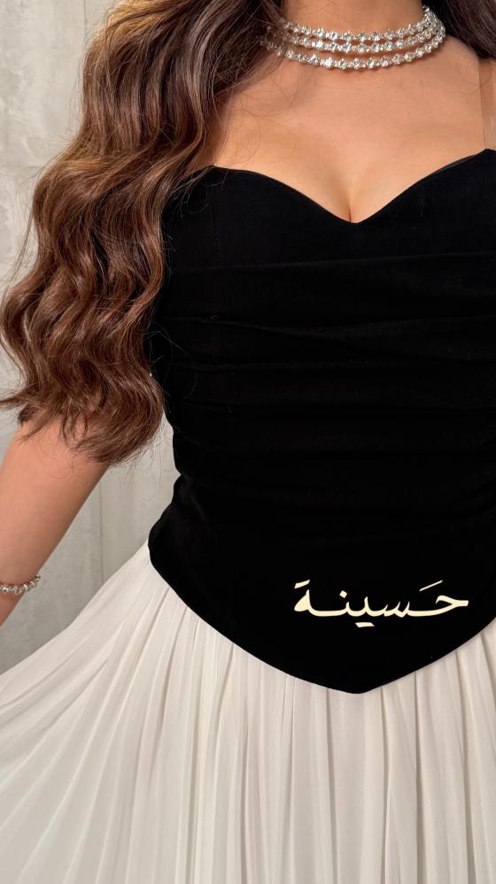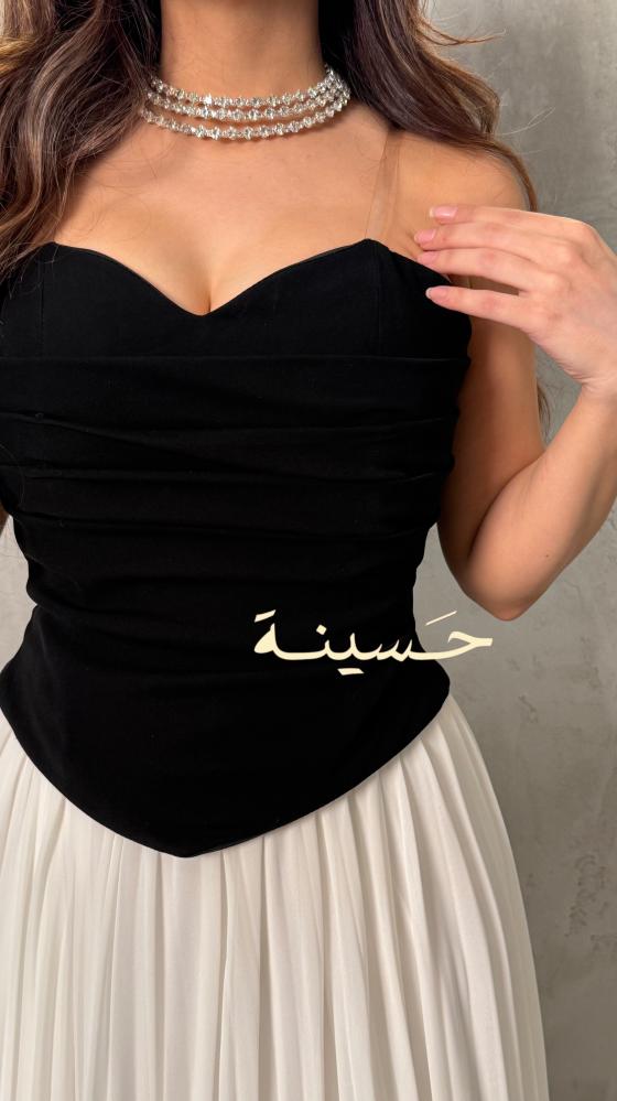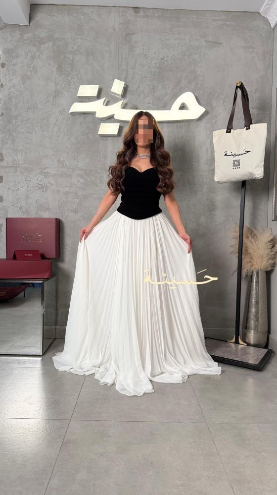 تصميم علوي بقصّة كورسيه ناعمة تعانق القوام بأناقة أنثوية، يقابله انسياب تنّورة حريرية بليسيه بيضاء تضيف حركة خفيفة آسرة في كل خطوة.