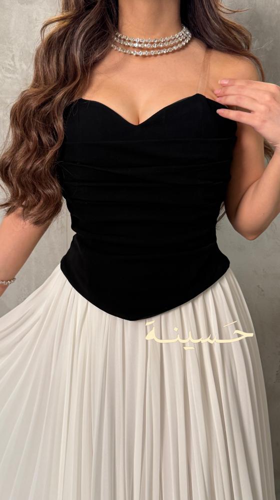 فستان يجمع بين فخامة الأسود ونقاء الأبيض في تناغم يعكس بساطة الفخامة.