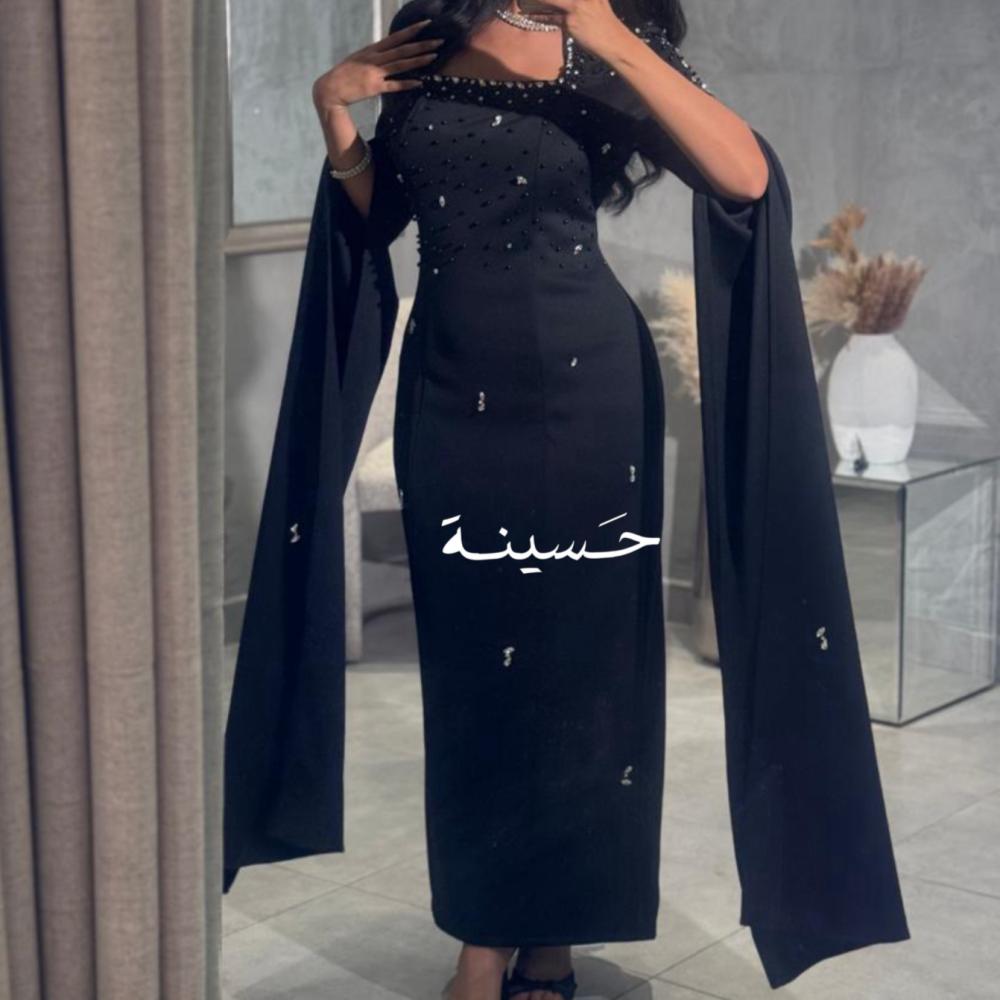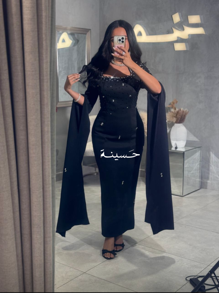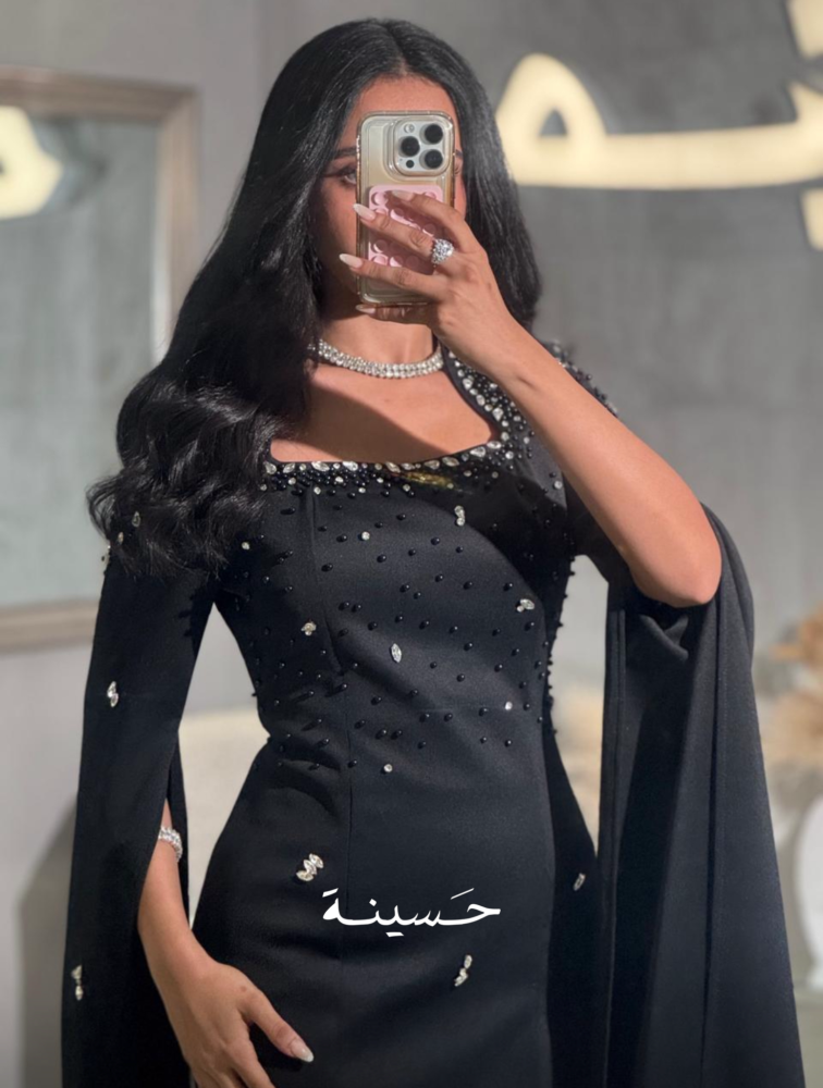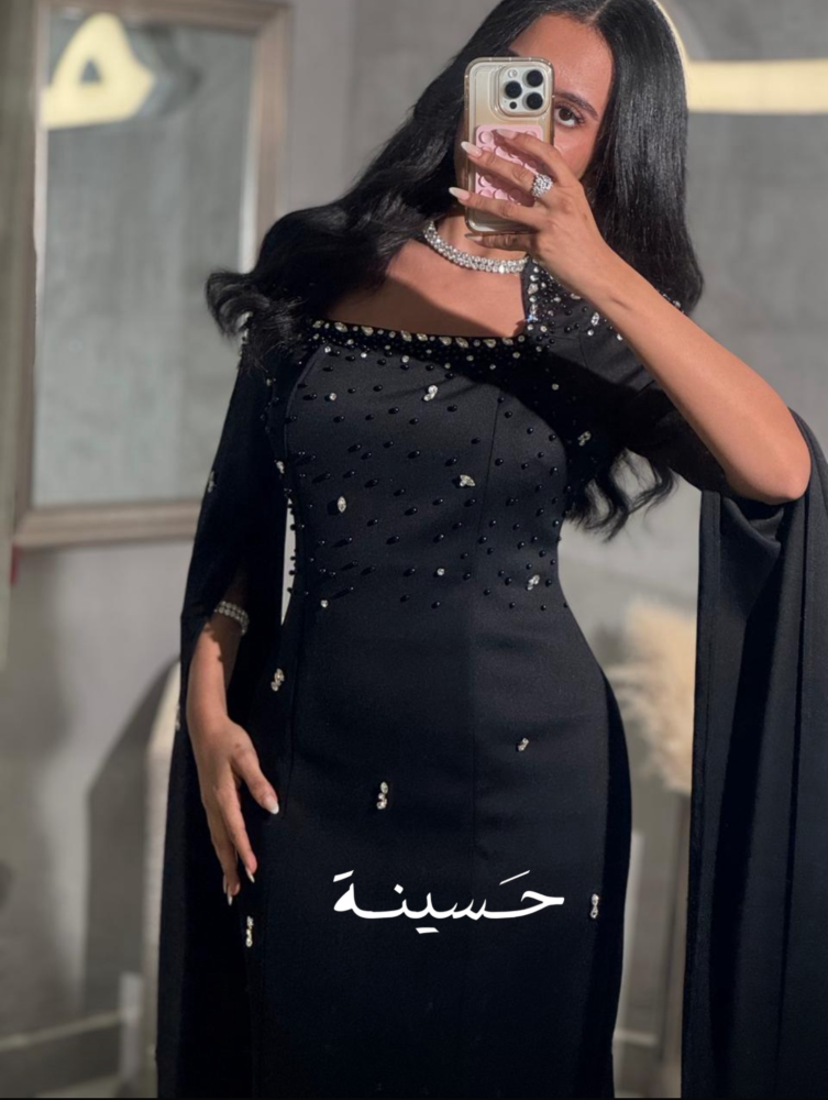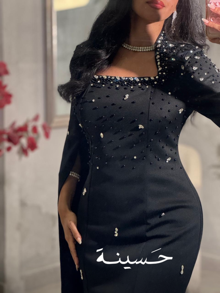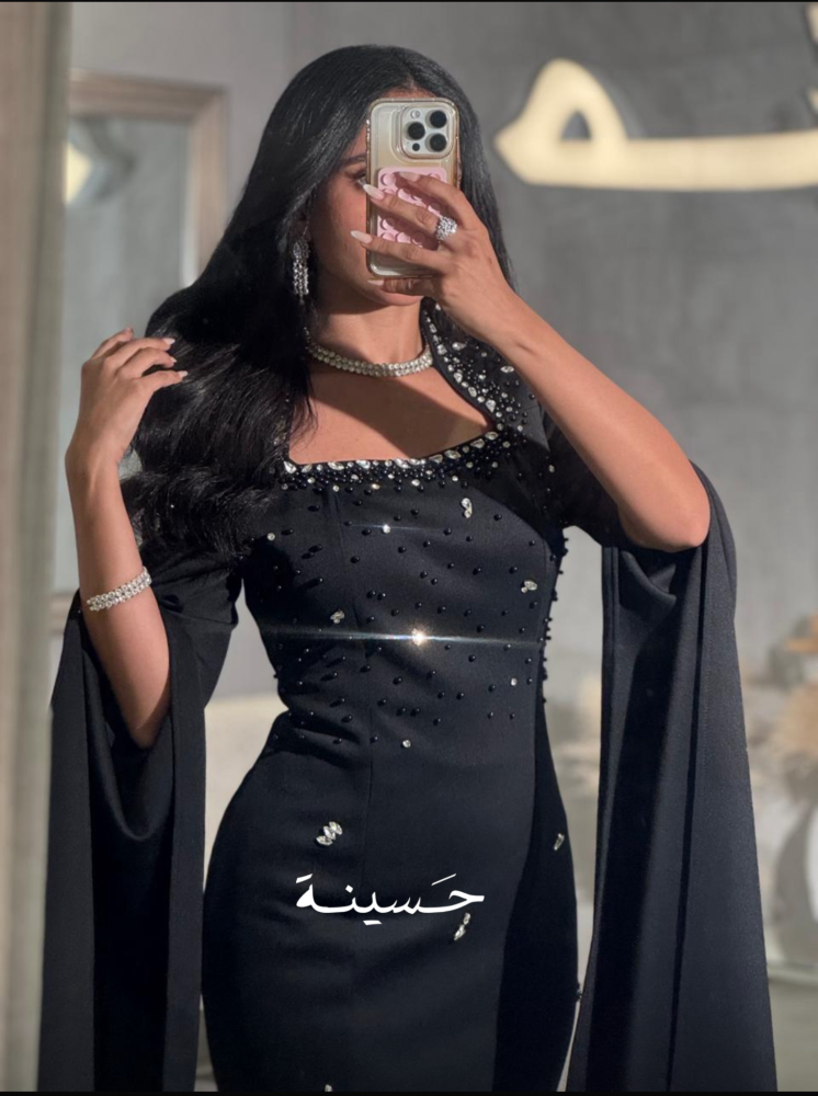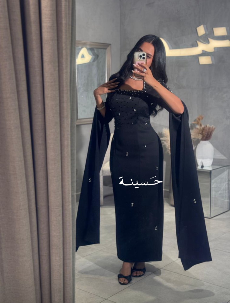 فستان مستقيم بياقة ناعمة وتطريز خفيففستان أسود مشدود بتطريز ناعم وكابات درامية من الأكتاف، يعطي حضور مهيب ولمعة أنثوية راقية.
