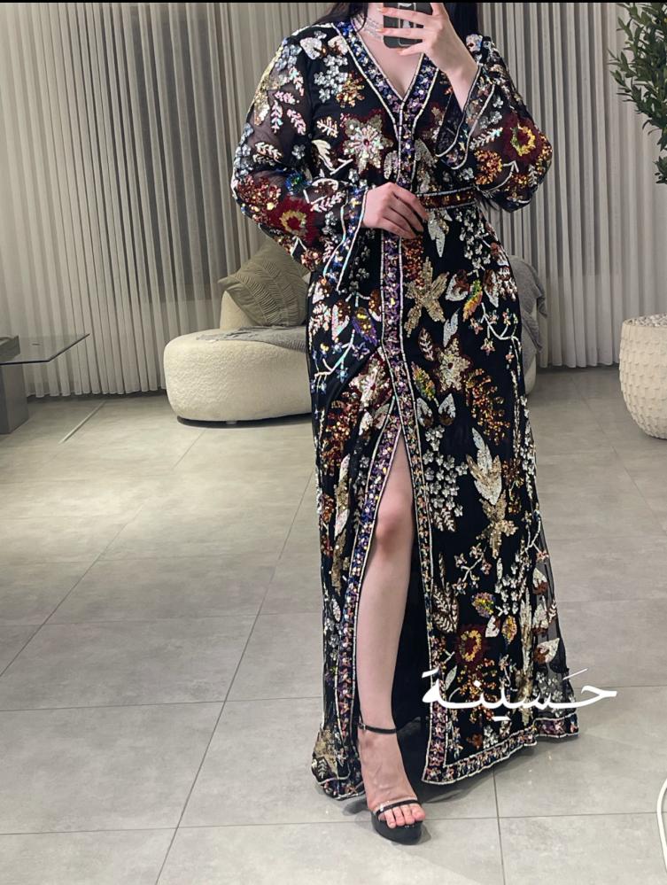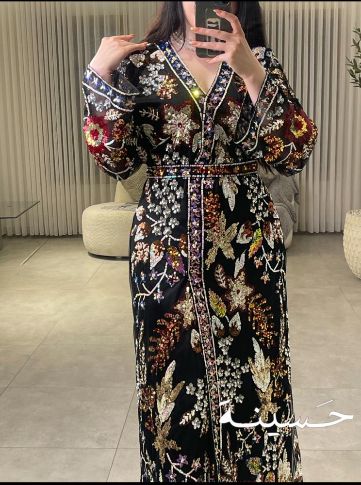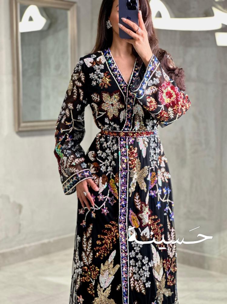 فستان سهرة طويل بلون أسود أنيق، مصنوع من قماش تول مطرز بالكامل برسومات زهور وأوراق ملونة من الترتر والخرز اللامع. يتميز بياقة V وأكمام طويلة واسعة تضيف لمسة فخمة، فيما ينسدل التصميم بشكل مستقيم يمنح إطلالة راقية ولافتة في المناسبات