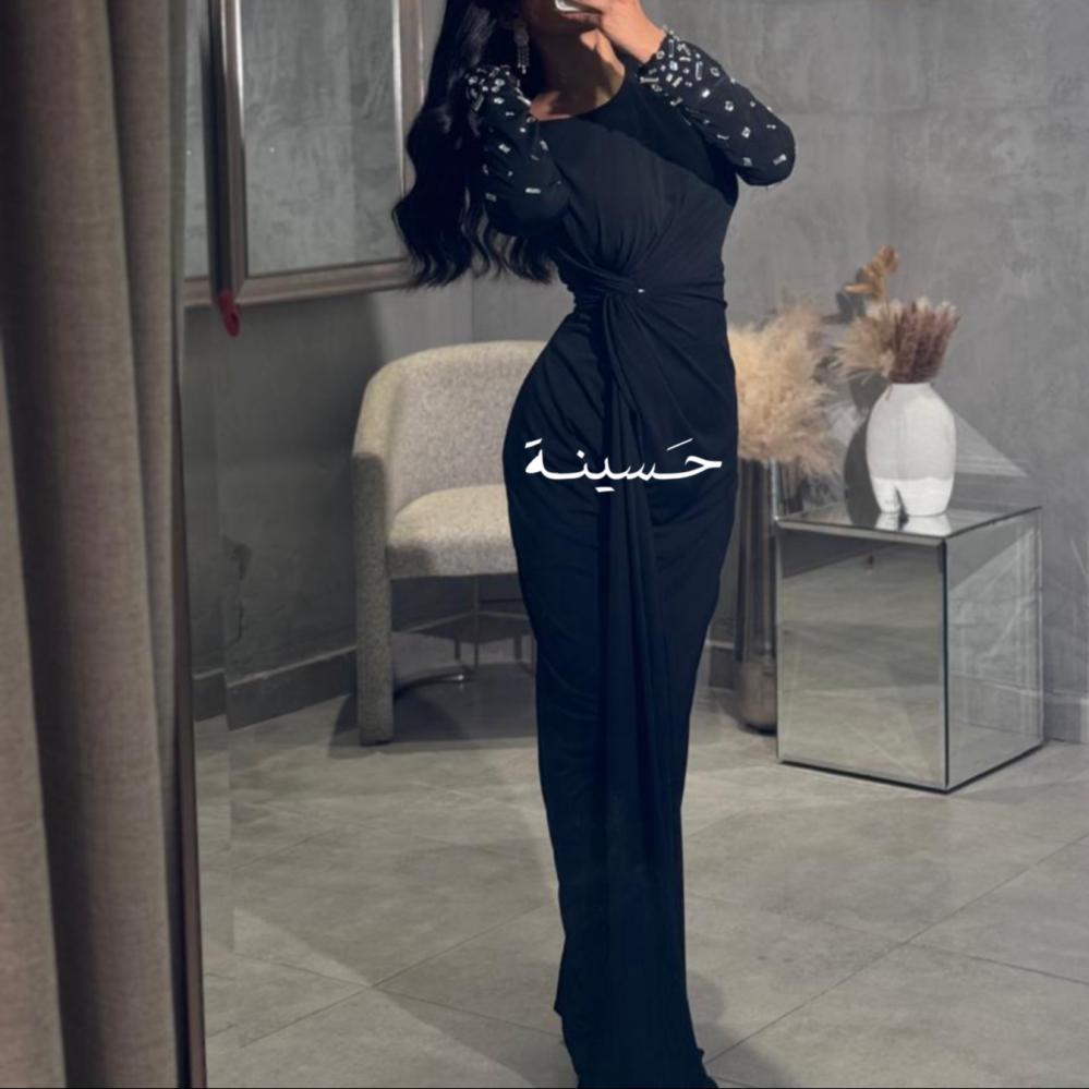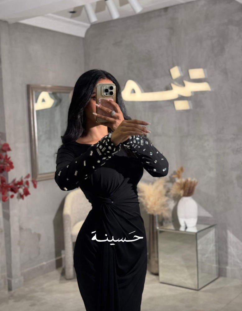 فستان أسود بقصة خصر مجمعة تبرز الجسمفستان أسود ناعم بقصة مشدودة وتفصيل على الخصر، مع أكمام مطرزة تضيف لمسة لمّاعة فخمة وأنيقة.