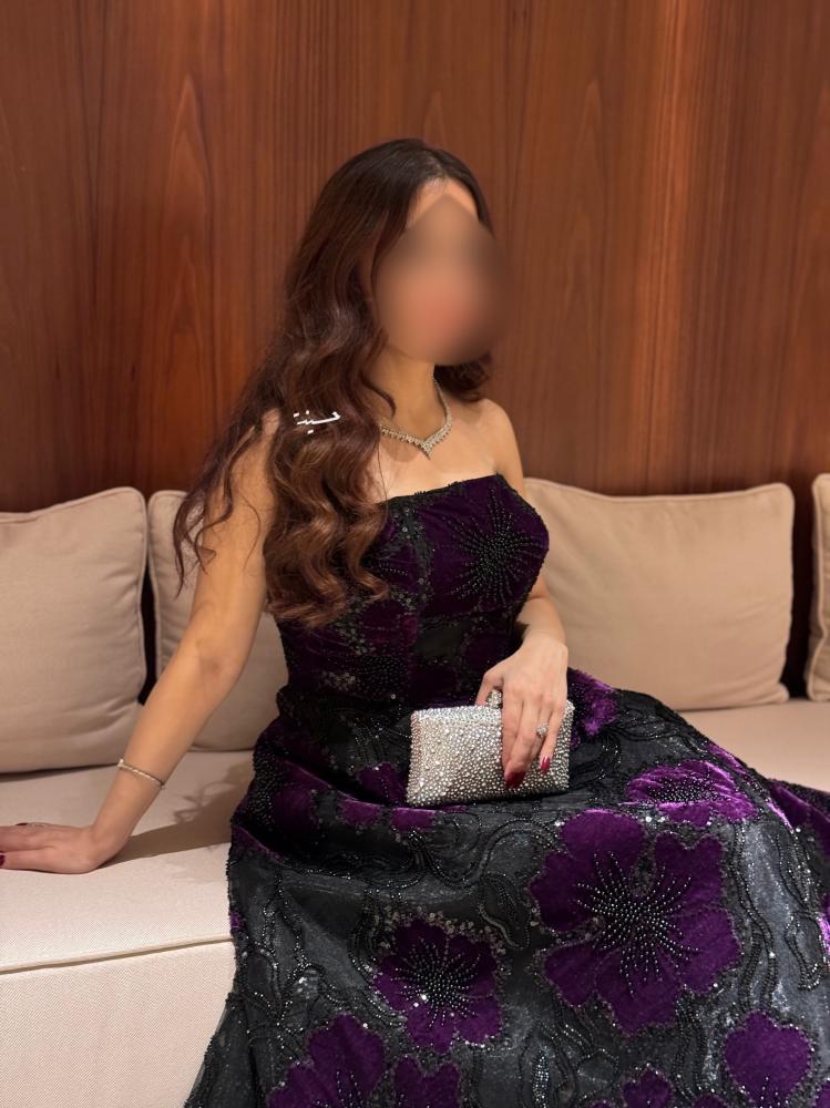 • اللون والتفاصيل: القماش أسود شفاف مرصّع بتطريز زهري بنفسجي داكن يُضفي عليه لمسة من الفخامة والجرأة. الزخارف تشبه الأزهار الكبيرة، مما يبرز جمال التصميم.