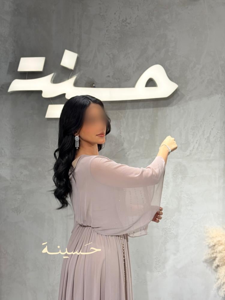 فستان سهرة أنيق بتصميم يجمع بين البساطة والفخامة، مصنوع من شيفون فاخر بلون رملي مائل إلى الموف الناعم، ينسدل بانسيابية خفيفة تمنح إحساساً بالراحة والرقي في آنٍ واحد.