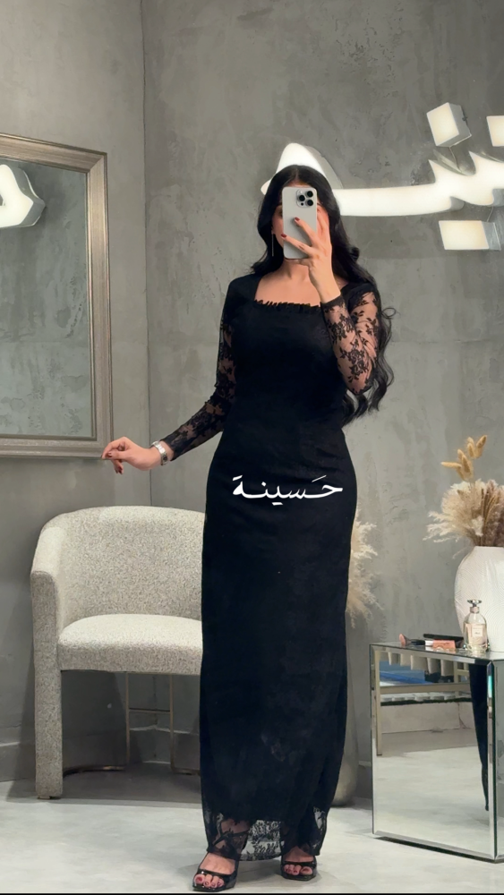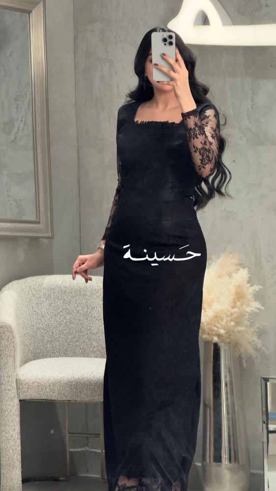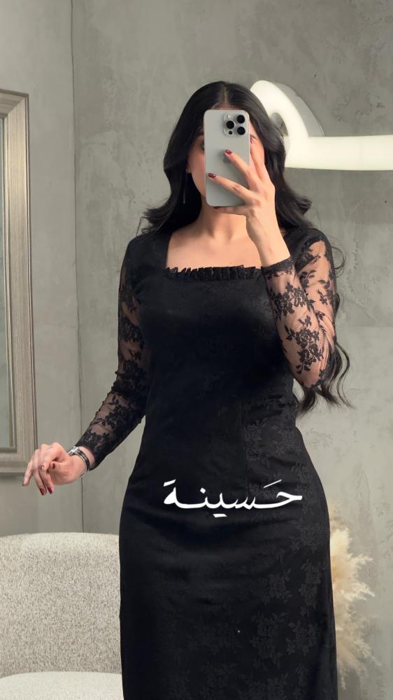 فستان أسود أنيق مصنوع من قماش دانتيل ناعم مع بطانة سادة، يتميّز بأكمام شفّافة مطرّزة بورود دقيقة تعكس فخامة ناعمة. القَصّة مستقيمة وبسيطة مع ياقة مربعة تضيف لمسة كلاسيكية راقية. مثالي للمناسبات الراقية بإطلالة أنثوية محافظة وأنيقة