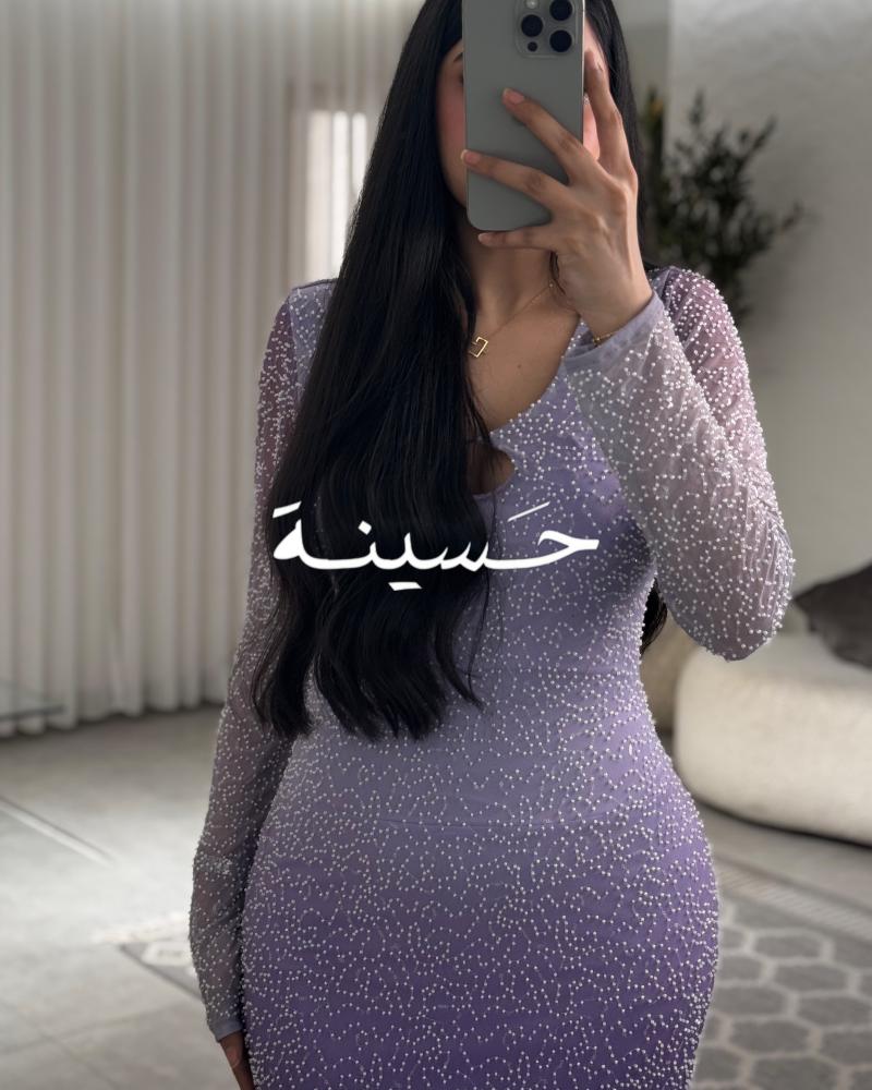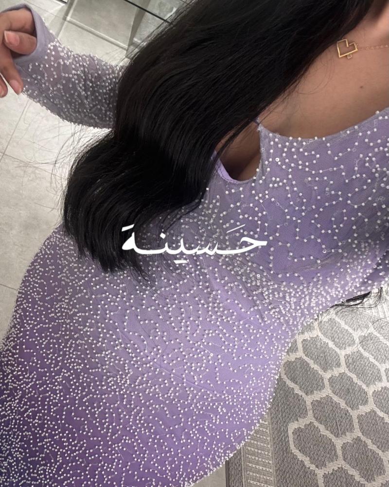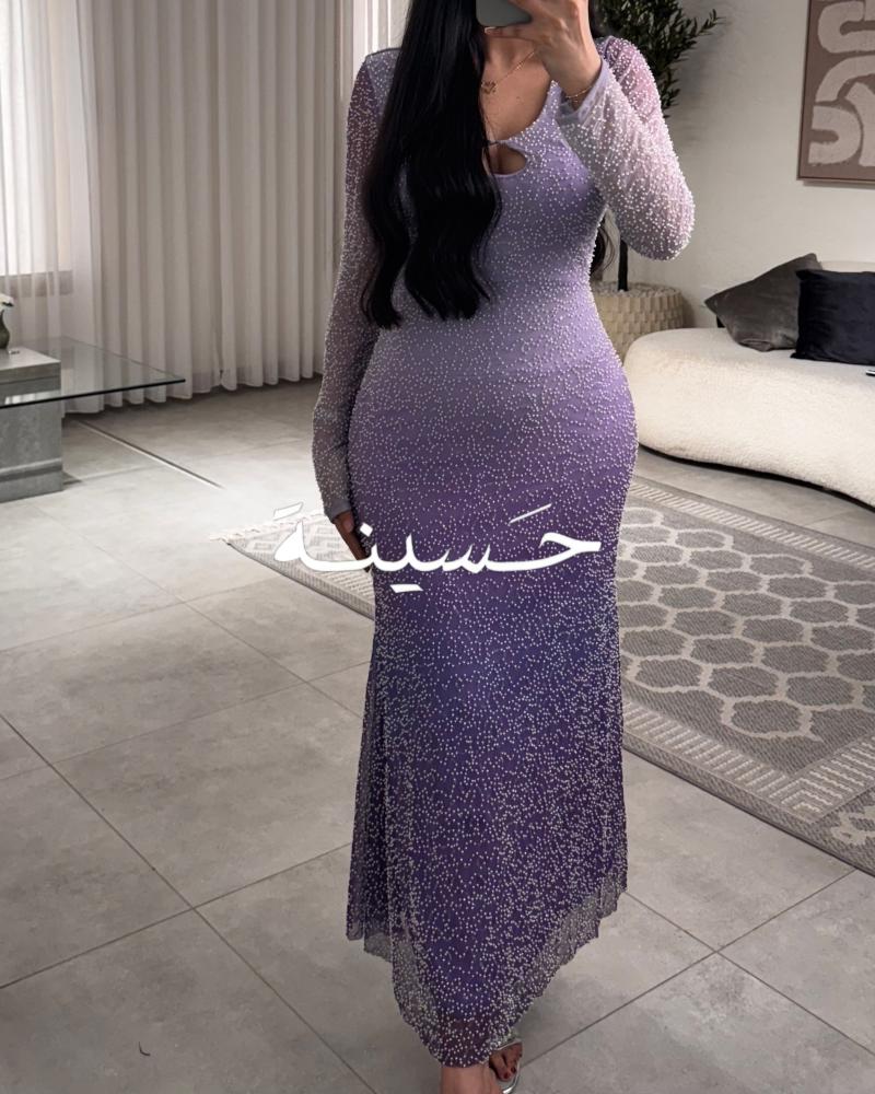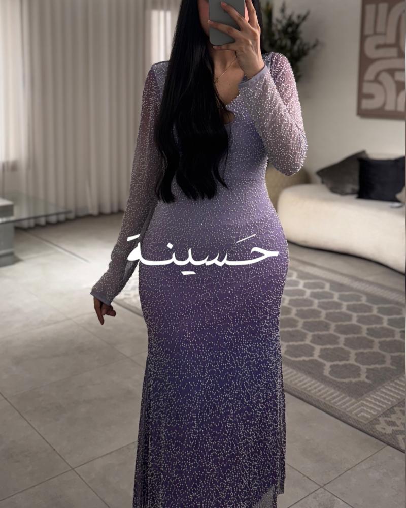 فستان طويل بكمّ كامل وقصة ملاصقة للجسم، مصنوع من قماش مطاطي مبطّن بلون بنفسجي متدرّج. مغطى بطبقة شيفون مطرزة بالكامل بترصيع ناعم بالخرز الأبيض، بتوزيع كثيف من الأعلى ويخف تدريجيًا للأسفل. يميّزه فتحة دائرية صغيرة عند الصدر، وأكمام شفافة بدون بطانة
