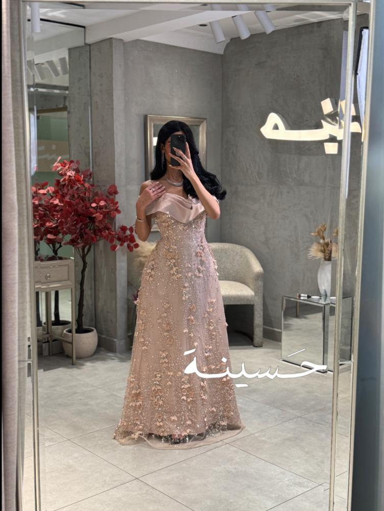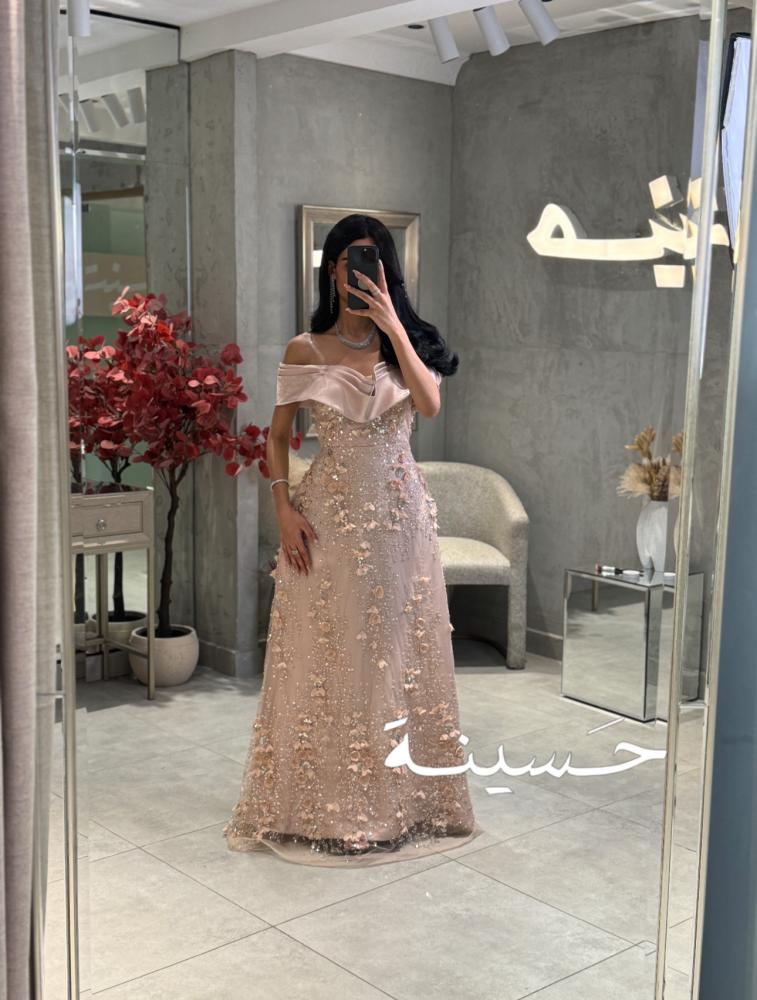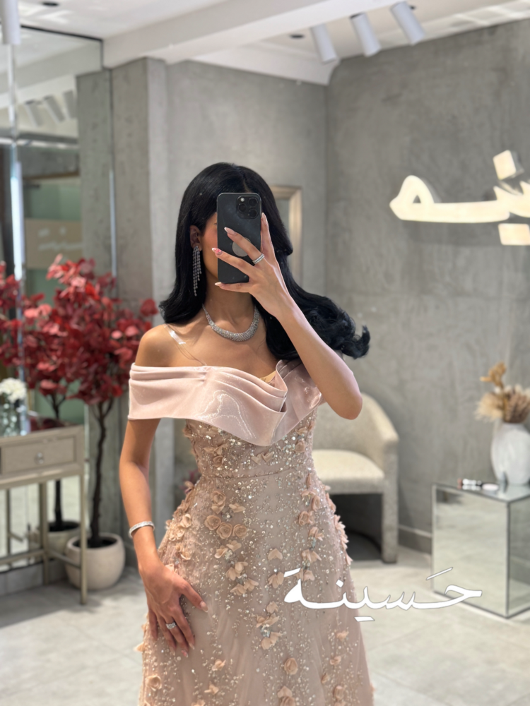 ، يتميّز بصدر مكشكش بطبقة ساتان عريضة تنسدل بنعومة على الكتفين. التنورة مصنوعة من تول مطرّز بالكامل بتفاصيل ثلاثية الأبعاد من الورود والخرز والكريستالات الصغيرة، مما يضفي عليه لمعة فاخرة وملمسًا ناعمًا. تصميم راقٍ ومثالي للحفلات والمناسبات الخاصة، يعكس الأنوثة بجاذبية ساحرة