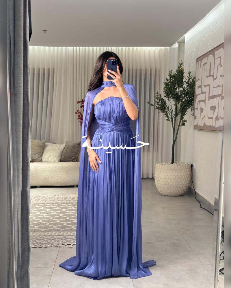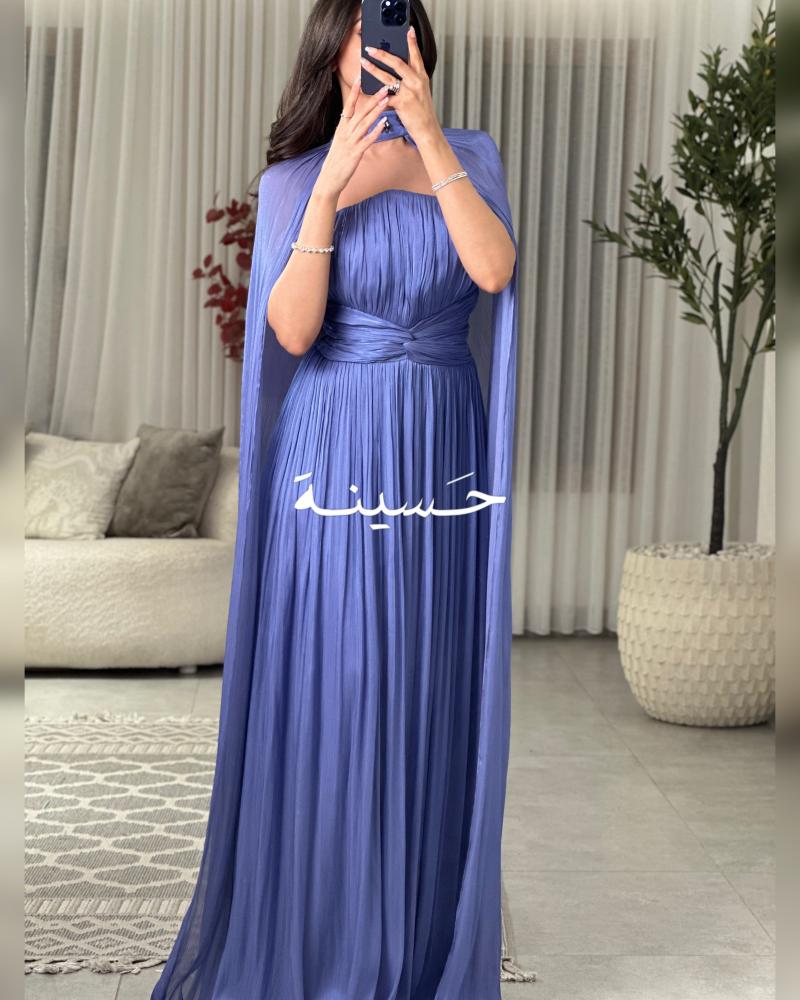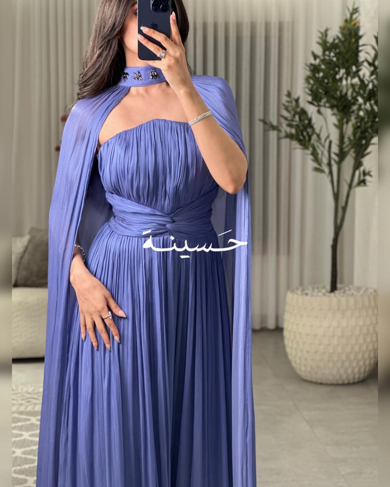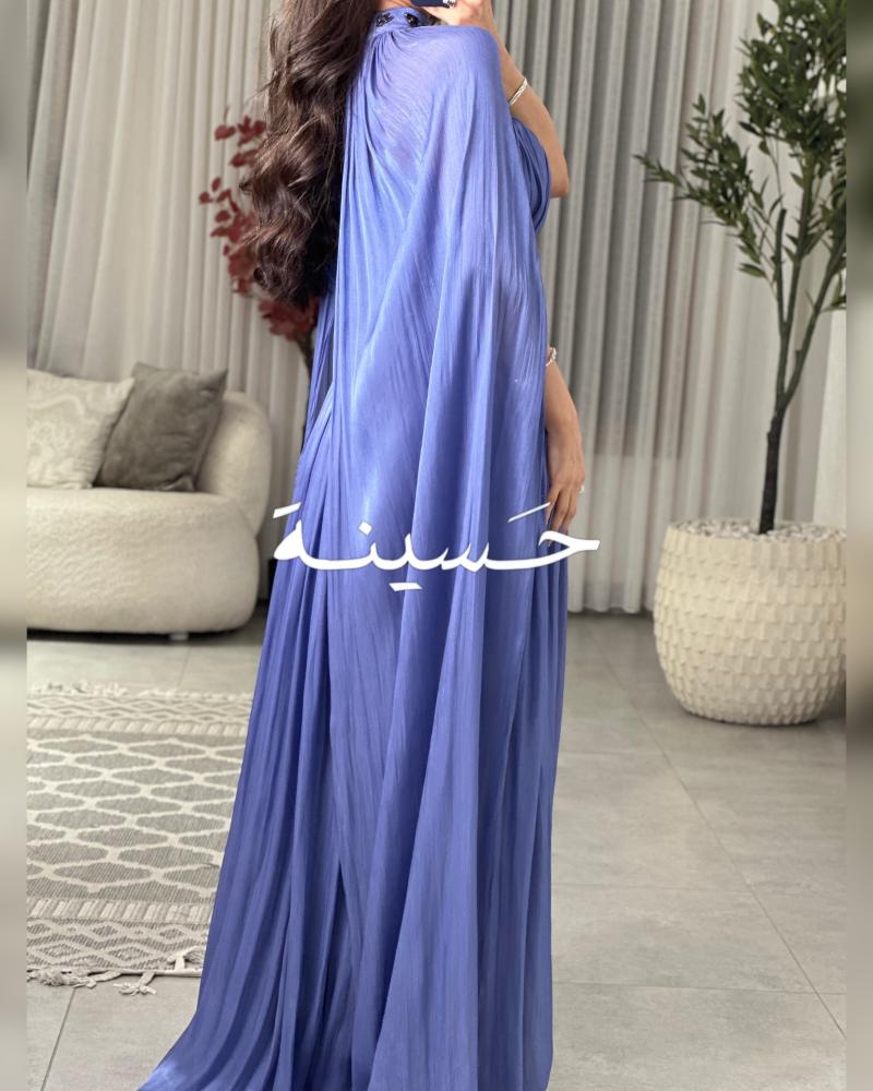 لونه بنفسجي فاتح مائل على الأزرق، قماش ساتان مطوي بشكل كامل يعطيه انسيابية وأناقة، مع كاب طويل متصل من الأكتاف وطوق مطرّز عند الرقبة يضيف لمسة ملكية