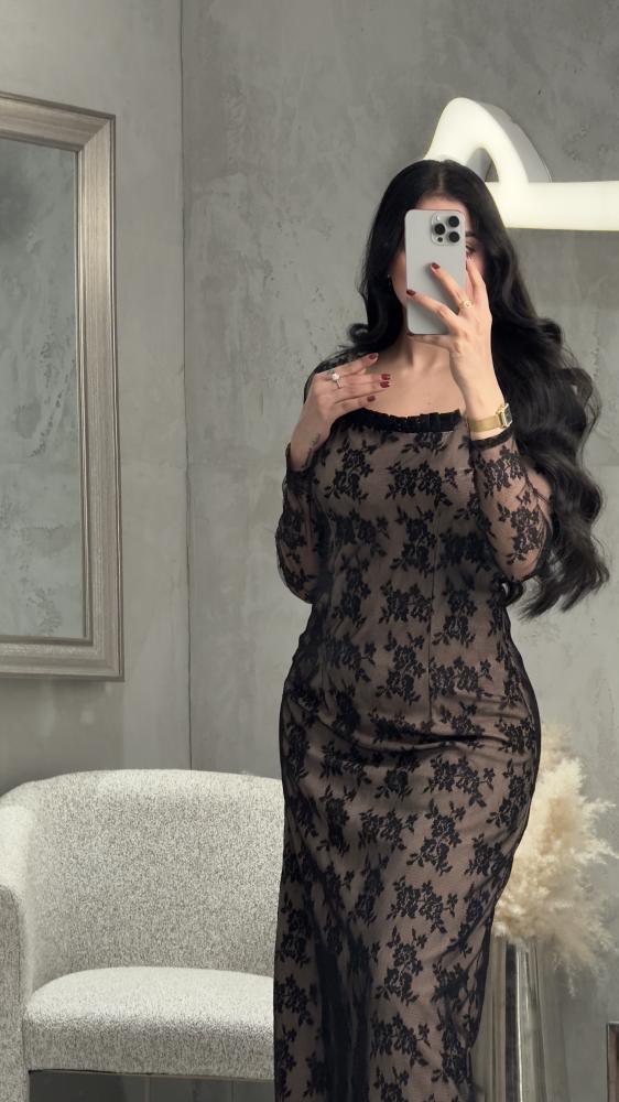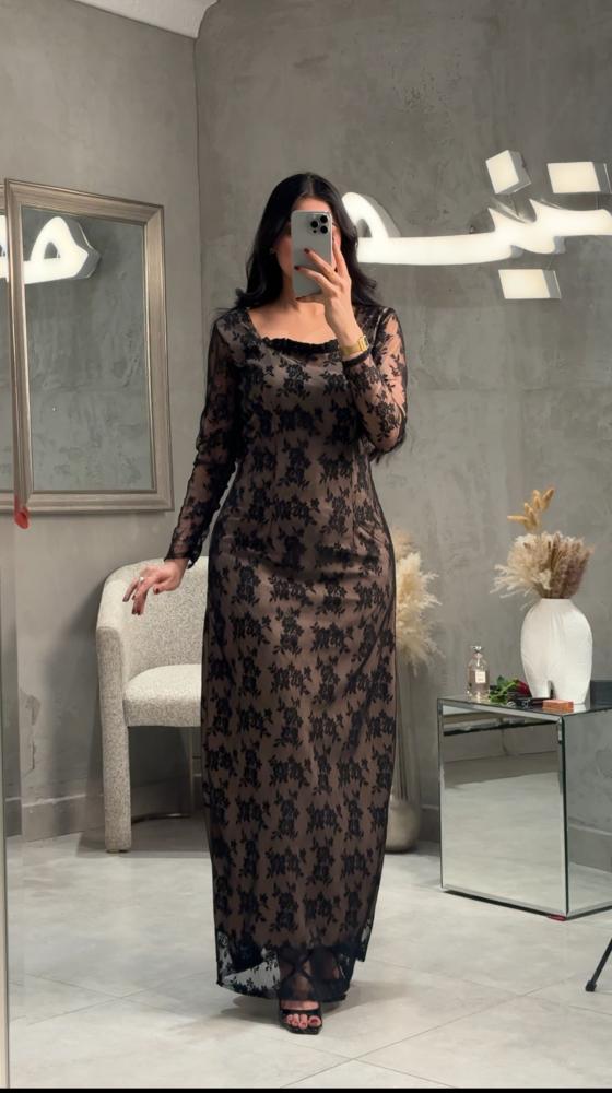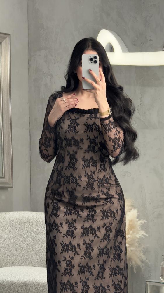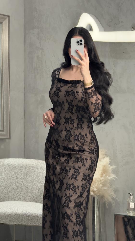 فستان دنتيل بطانه بيجفستان ميدي أنيق بقماش تول شفاف مطرّز بنقشات سوداء على بطانة بيج، يتميّز بياقة مربعة وأكمام طويلة تضيف لمسة راقية وناعمة. التصميم يجمع بين الكلاسيكية والأنوثة بأسلوب هادئ وفخم
