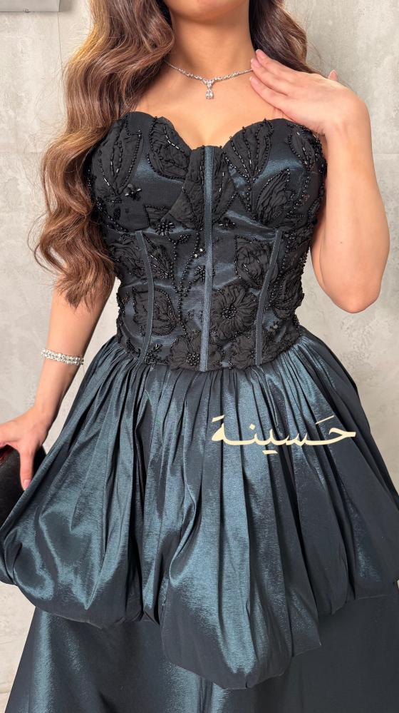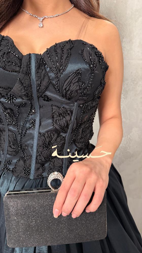 فستان أسود آسر بتصميم كورسيه مطرّز يدويًا بتفاصيل دقيقة من الخرز الأسود والزهور البارزة، يبرز أنوثة الخصر بخطوط انسيابية وجاذبية خفية.