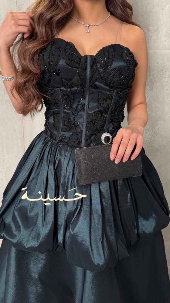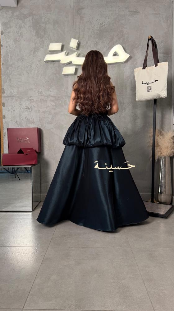 يتميز بتنورة فاخرة بقماش لامع بلمسة مخملية ناعمة مع طيّات منتفخة تمنح الفستان حضورًا ملكيًا راقيًا.