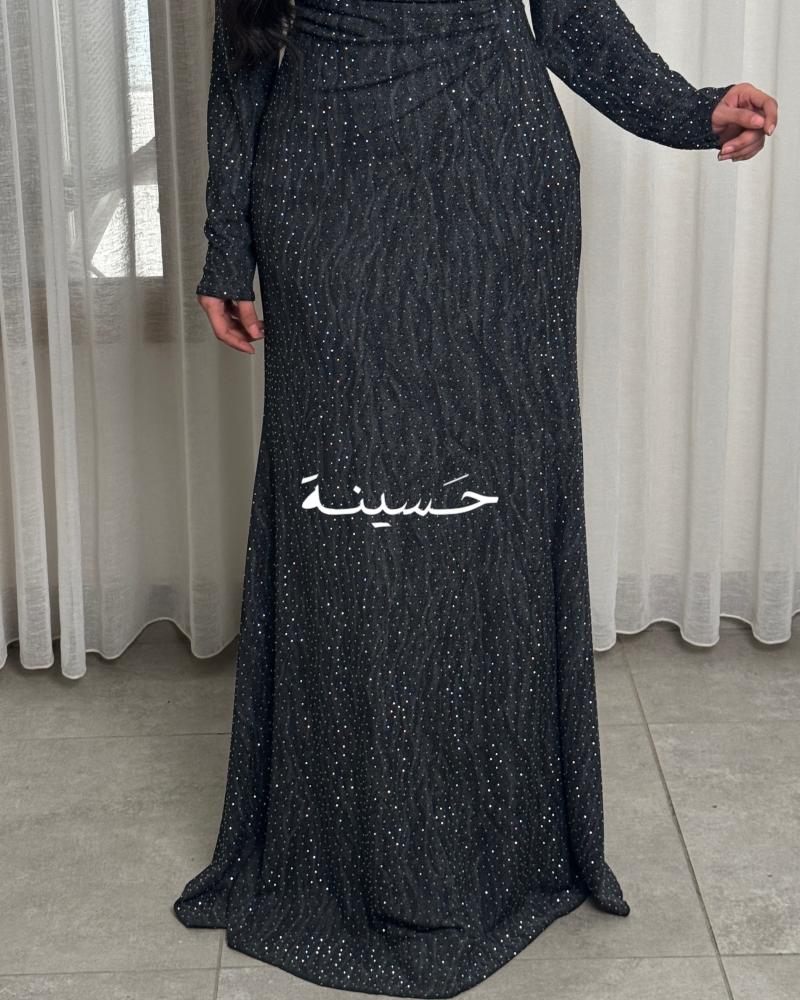 فستان طويل بقصة ضيّقة وكمّ كامل، مصنوع من قماش أسود مرن ومريح. مزخرف بالكامل بترصيع خفيف يلمع بألوان متعددة على شكل خطوط ناعمة تعطي تأثير بصري لافت. يضم فتحة بسيطة عند أعلى الصدر مع درابية خفيفة على الجنب تضيف تحديد وانسيابية للقصّة. الخامة غير لامعة لكنها تعكس الإضاءة مع حبيبات الترتر الصغيرة