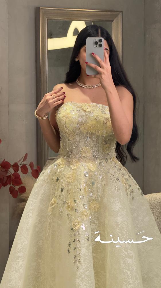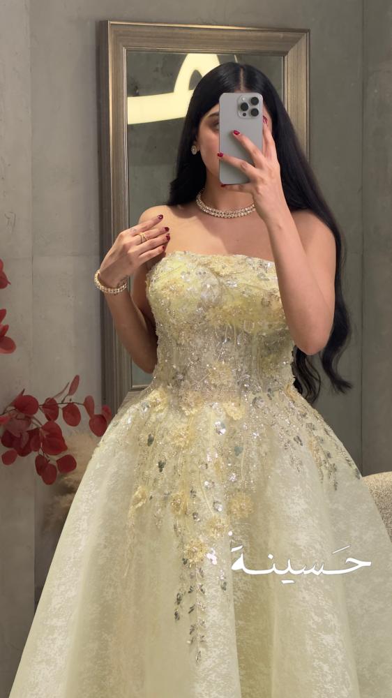An ivory gown with a luxurious, puffy design, crafted from soft fabric with a luxurious, floral look, adorned with hand-embroidered pearls and crystals in delicate detailing across the chest and waist. The sleeveless cut gives it a sophisticated, feminine touch, suitable for royal parties and memorable occasions.