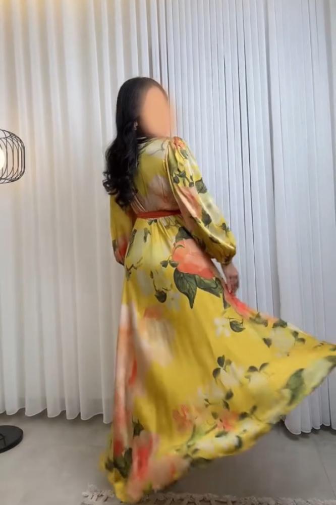 A long, soft chiffon dress in yellow floral print features an elegant and vibrant design suitable for veiled women. It comes with a red belt that attractively highlights the figure and adds a beautiful contrast to the color of the dress. The long sleeves give you a modest and elegant look. The dress is ideal for special occasions and evenings, giving you a feminine and attractive appearance without sacrificing comfort and modesty.