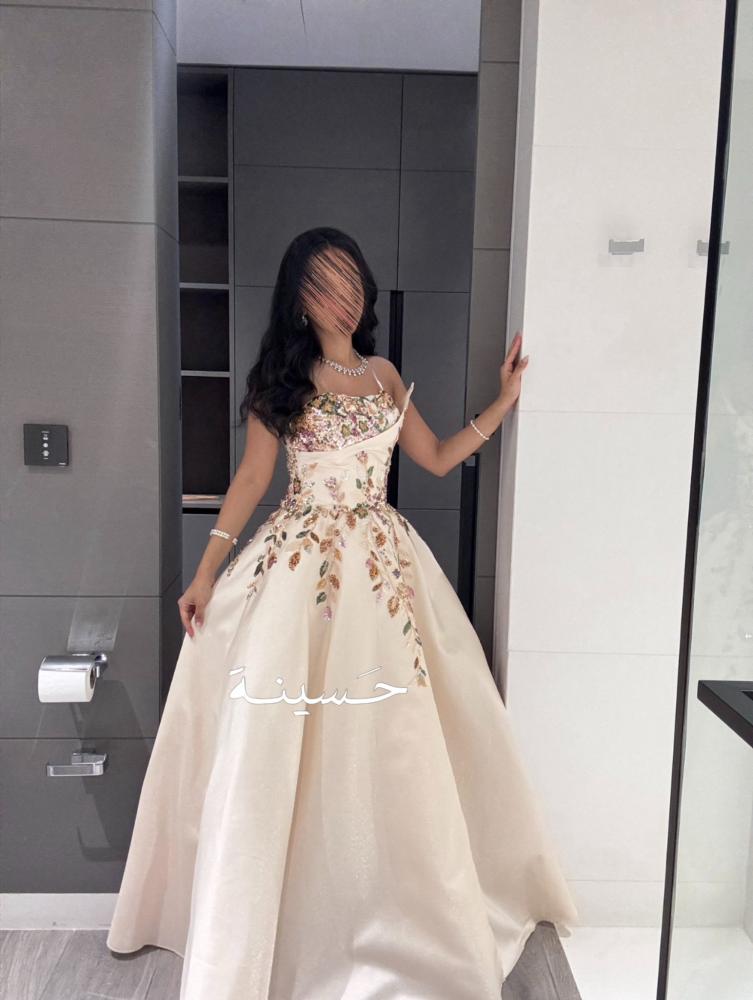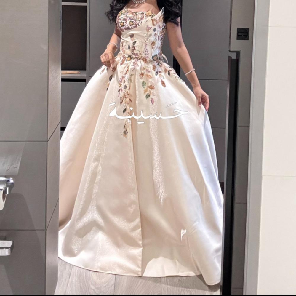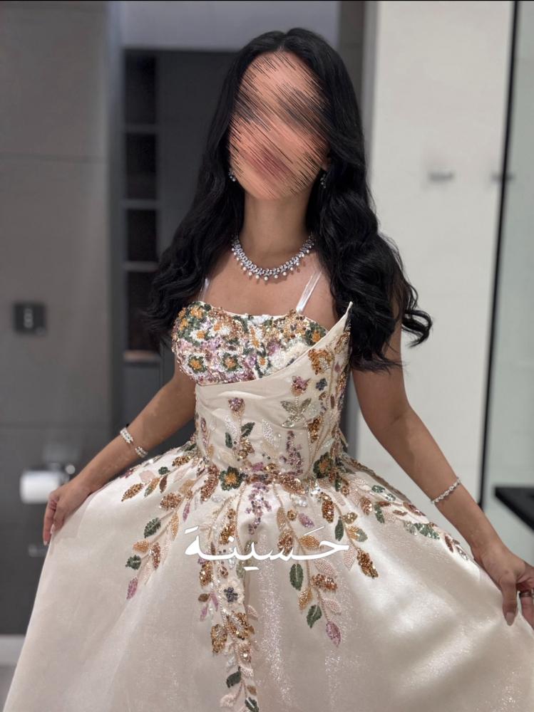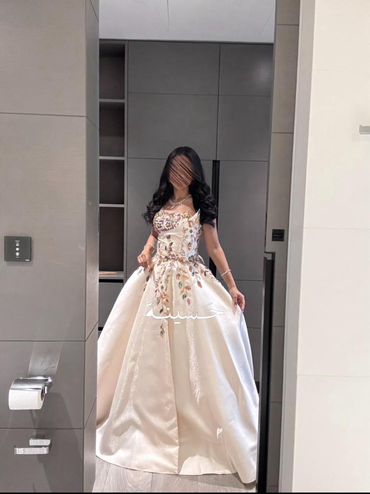 Dress with a wide skirt and colorful plant embroidery A royal ivory gown with delicate pink embroidery at the top and a luxurious puffy skirt, combining classic softness with modern details.