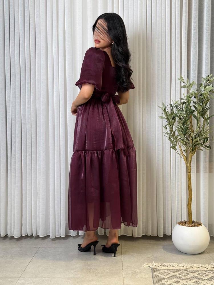 Stand out with this gorgeous burgundy dress! The half-sleeve design adds an elegant touch, with an open neckline for an attractive style. The slightly flared skirt gives you movement and elegance, while the lower part of the dress features a tiered design in terms of shape and details, adding a unique touch. Its material is light and comfortable, perfect for various occasions.