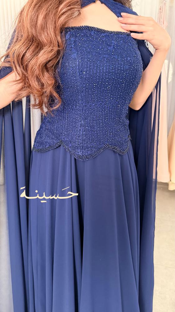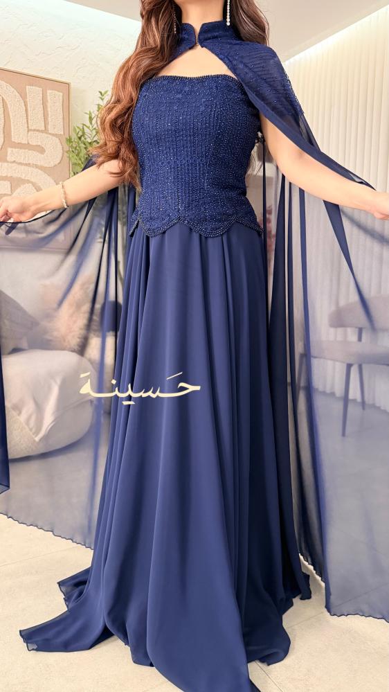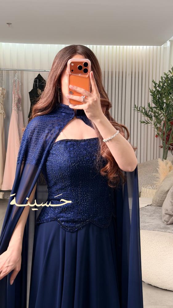 A luxurious evening dress in deep navy, exuding elegance and serenity, inspired by the magic of quiet nights.