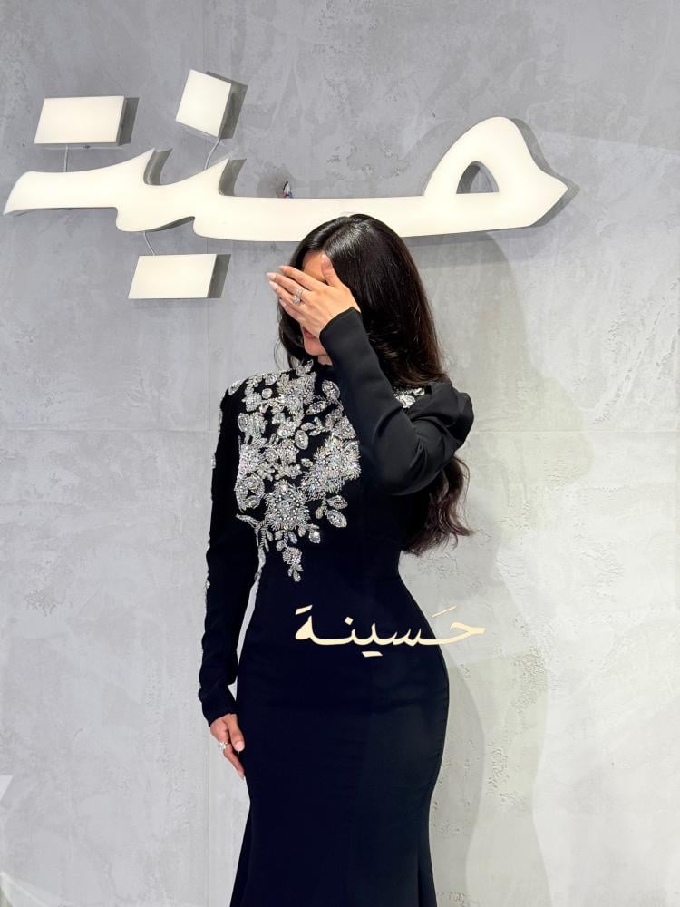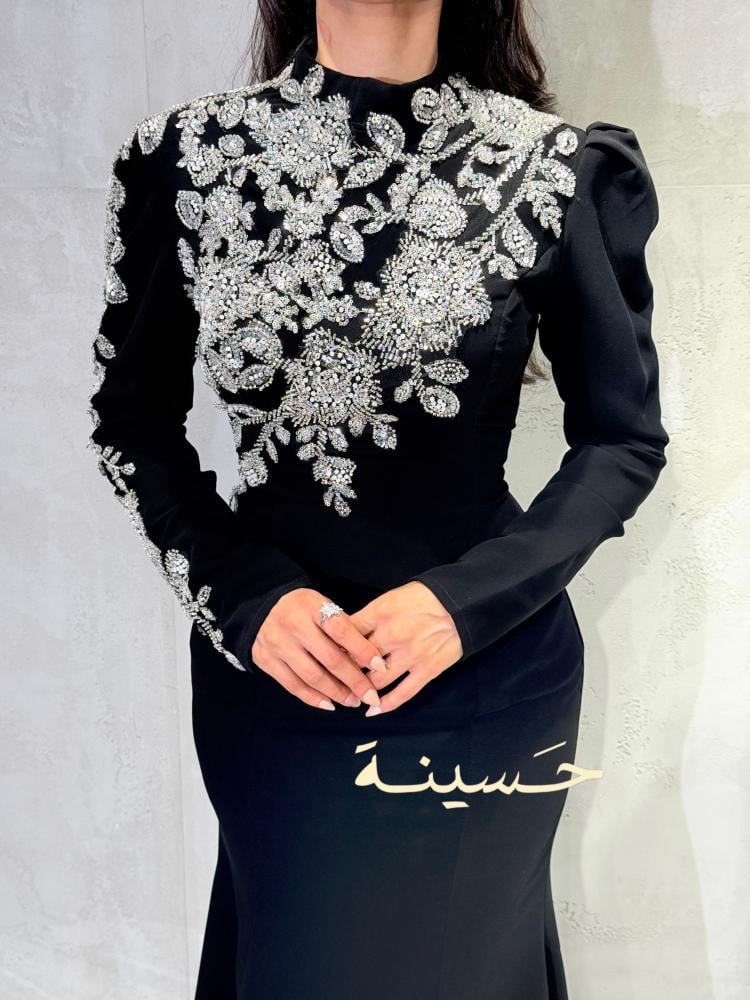 An elegant, long black dress with a fitted silhouette. It features luxurious, sparkling crystal embroidery on the chest and sleeves, in an interwoven floral design that lends it a touch of sophisticated luxury. The dress features long sleeves with a prominent shoulder and a flowing cut that extends downward, creating a regal look suitable for evening parties and luxurious occasions.