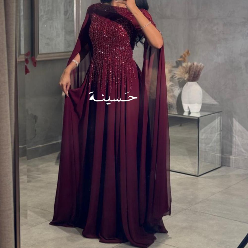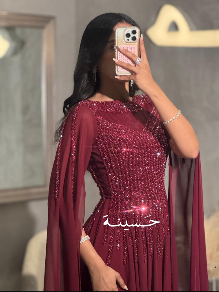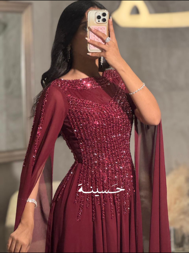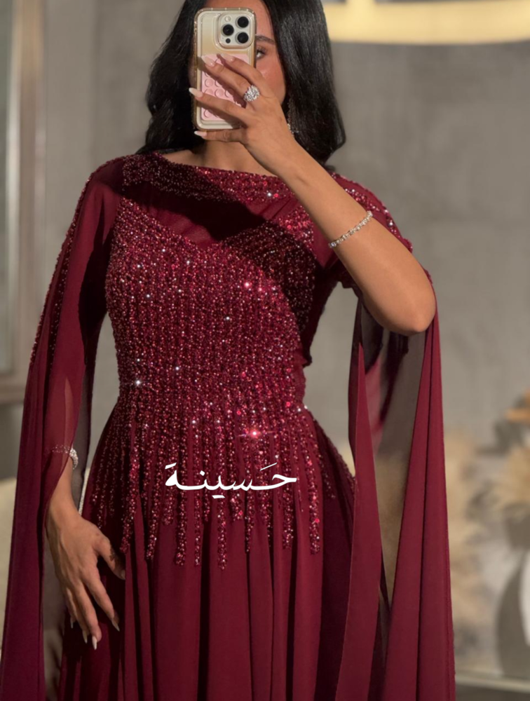 هذا فستان كاب بلون خمري وتطريز لامعفستان عنّابي من الشيفون بطبقة علوية مطرزة ولمّاعة، مع كابات منسدلة تعطي إحساس ملكي فخم ولمسة أنوثة خيالية.